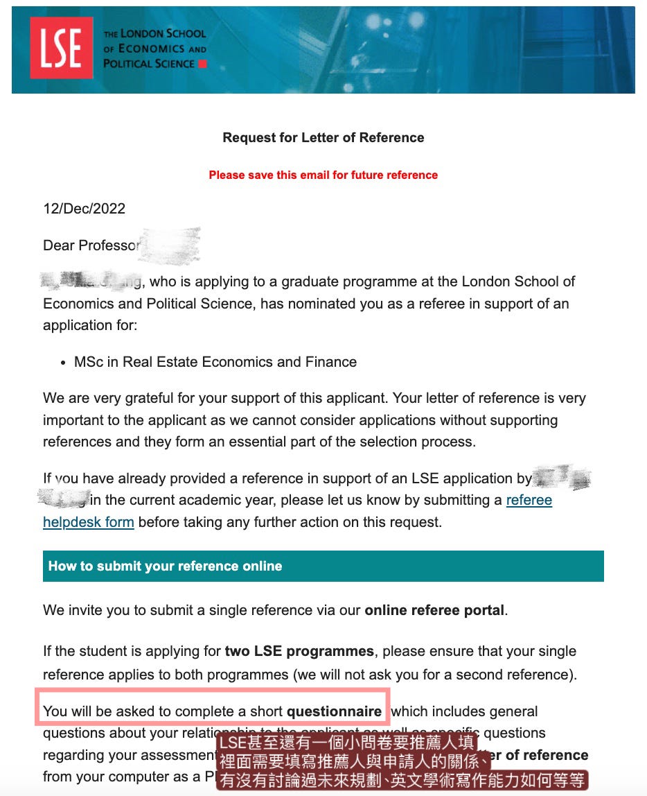 因為有些學校的推薦信連結是有時間限制的(像是UCL發給推薦人的連結只有30天有效期),所以如果提交申請後1–2週推薦人都沒有收到學校要求上傳推薦信的郵件,最好聯絡學校查詢申請進度,以免錯過上傳的期限。