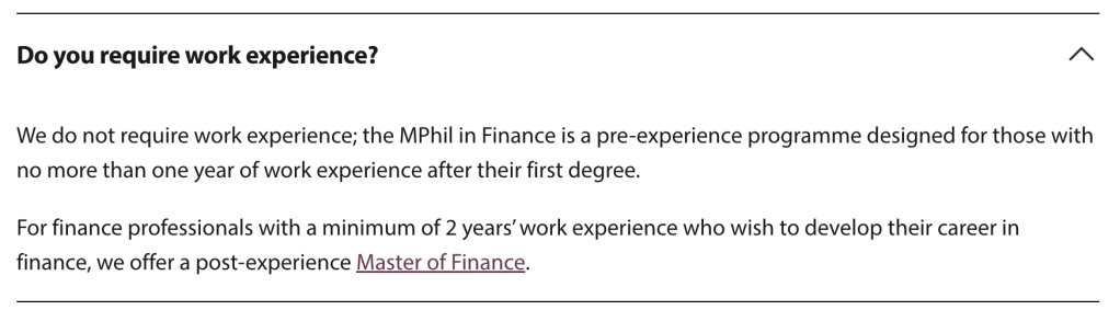 但如果你是剛畢業,或只有短期實習經歷,並且對金融理論、研究路線有興趣、未來甚至考慮攻讀博士,那麼 MPhil in Finance會更適合